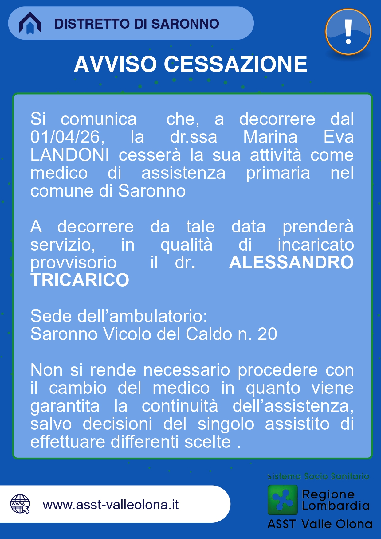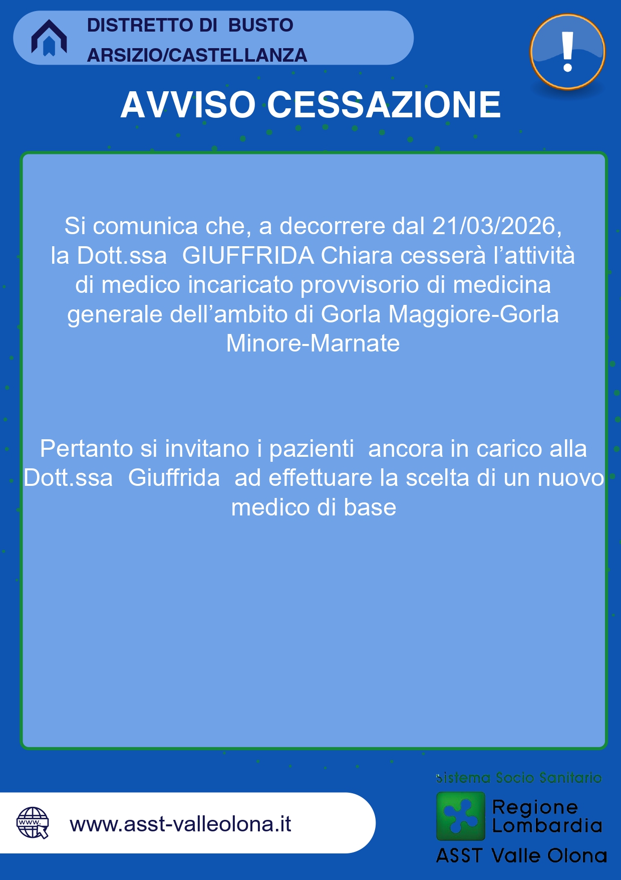 In questa pagina sono pubblicati gli avvisi che riguardano la cessazione / sospensione dell' attività per pensionamento o altri motivi, nonchè l'eventuale riavvio, dei Medici di Medicina Generale e dei Pediatri di Libera Scelta degli ambiti territoriali facenti capo a questa ASST. Cliccando sulla miniatura l'immagine viene ingrandita. A questo link si trovano, invece, gli avvisi relativi all' attivazione degli Ambulatori Temporanei.
