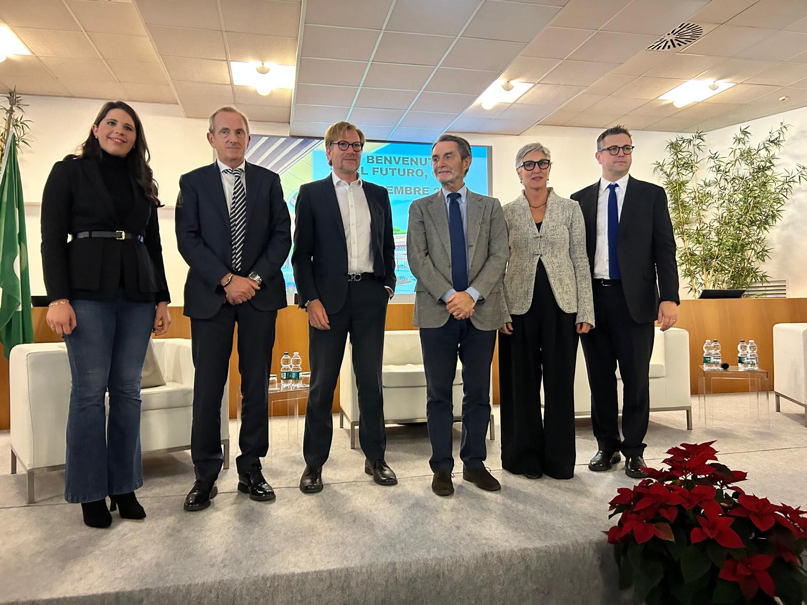 Da sx a dx: Ottavia Boisio – ARIA Spa, Emanuele Antonelli – sindaco di Busto Arsizio, Paolo Zilli – Zaha Hadid Architects, Attilio Fontana – Presidente Regione Lombardia, Daniela Bianchi – Direttore Generale ASST Valle Olona, Andrea Cassani – Sindaco di Gallarate