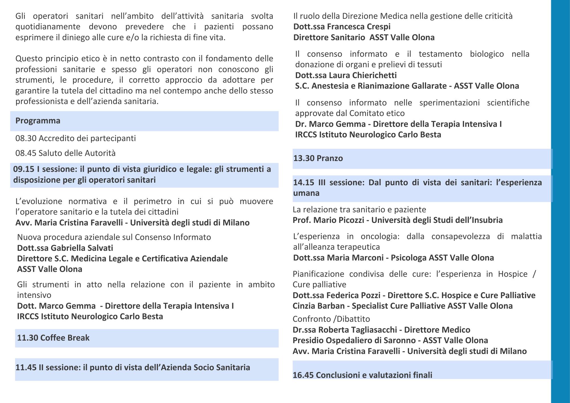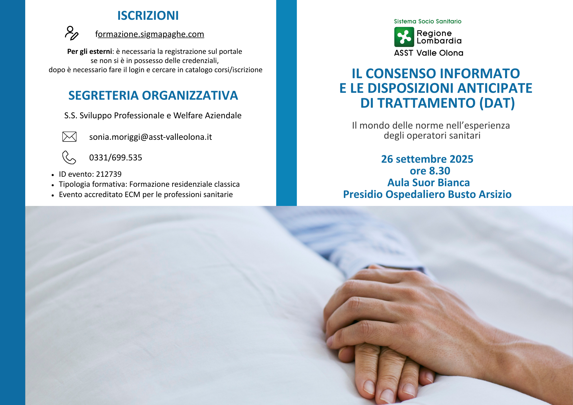 Il 26 settembre, alle ore 8.30 in Aula Suor Bianca (Presidio Ospedaliero Busto Arsizio), si svolgerĆ  il Convegno “Consenso Informato e Disposizioni Anticipate di Trattamento”.
