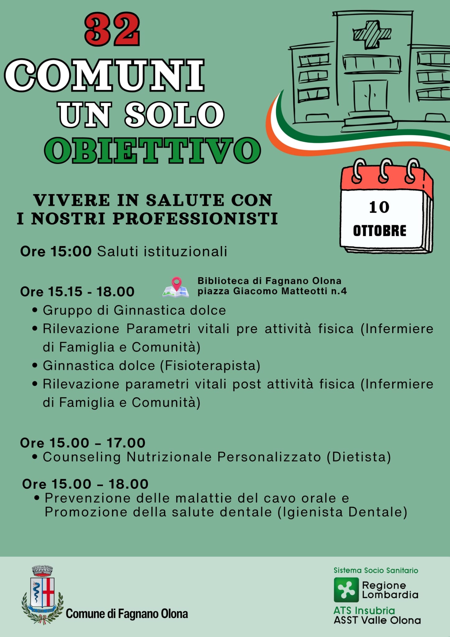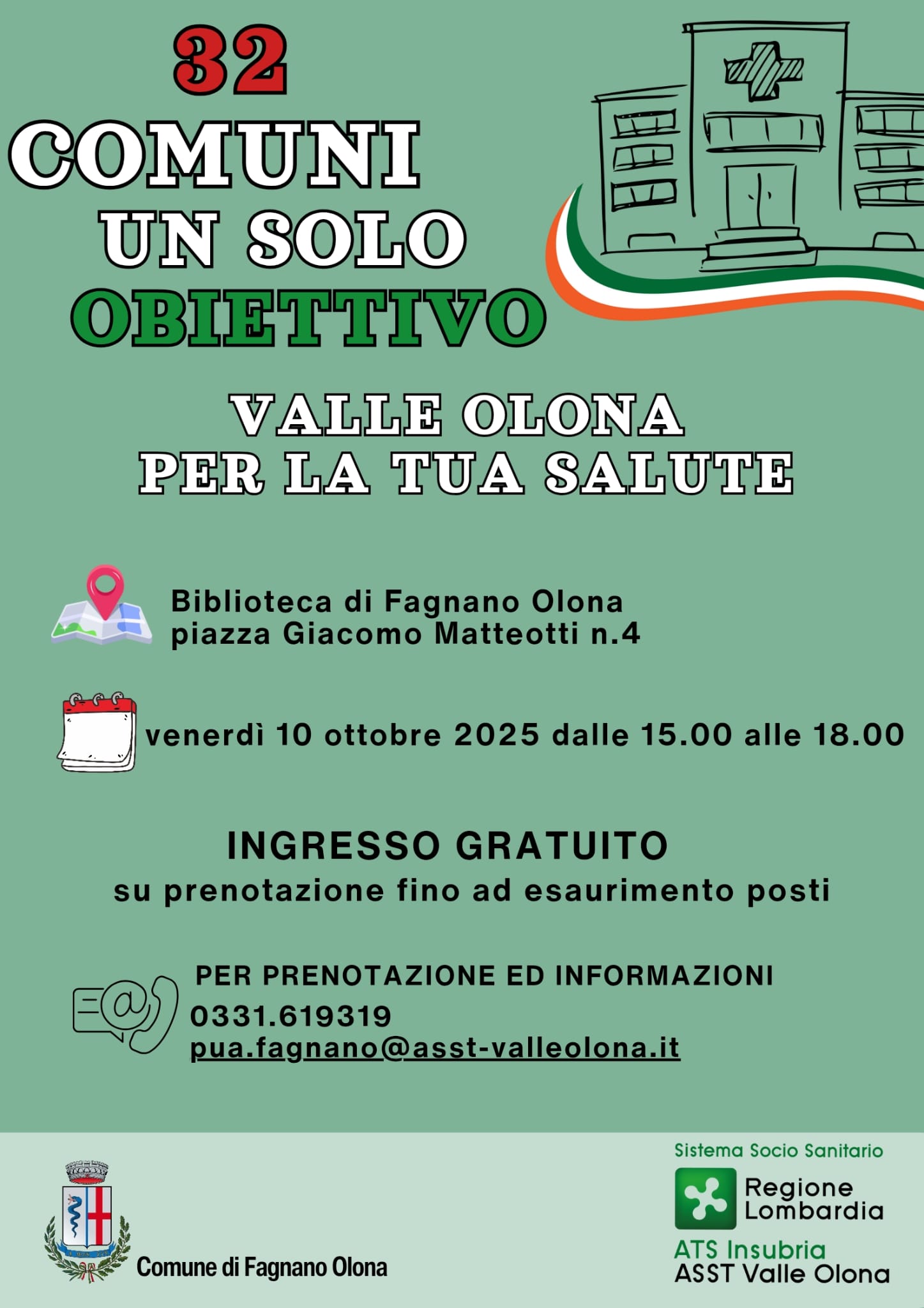 Il progetto 32 Comuni un solo obiettivo: Valle Olona per la tua salute, voluto dalla Direzione Socio Sanitaria di ASST Valle Olona, in collaborazione con le Amministrazioni Comunali aderenti, mira ad aprire alla popolazione una serie di attività e servizi dedicati alla promozione della salute pubblica e quanto più possibile personalizzati sui bisogni rilevati nei singoli ambiti in modo da raggiungere capillarmente gli utenti e far conoscere i servizi svolti nelle Case di Comunità e sul Distretto.