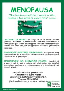Il Consultorio del Distretto di Busto Castellanza organizza un percorso di tre incontri sul tema della menopausa al fine di dialogare e comunicare con le donne, così da divulgare informazioni corrette, creare consapevolezza, favorire il miglior adattamento in termini di benessere attraverso la capacità di ascoltarsi, prendersi cura di sé e aver fiducia nelle proprie decisioni e scelte.