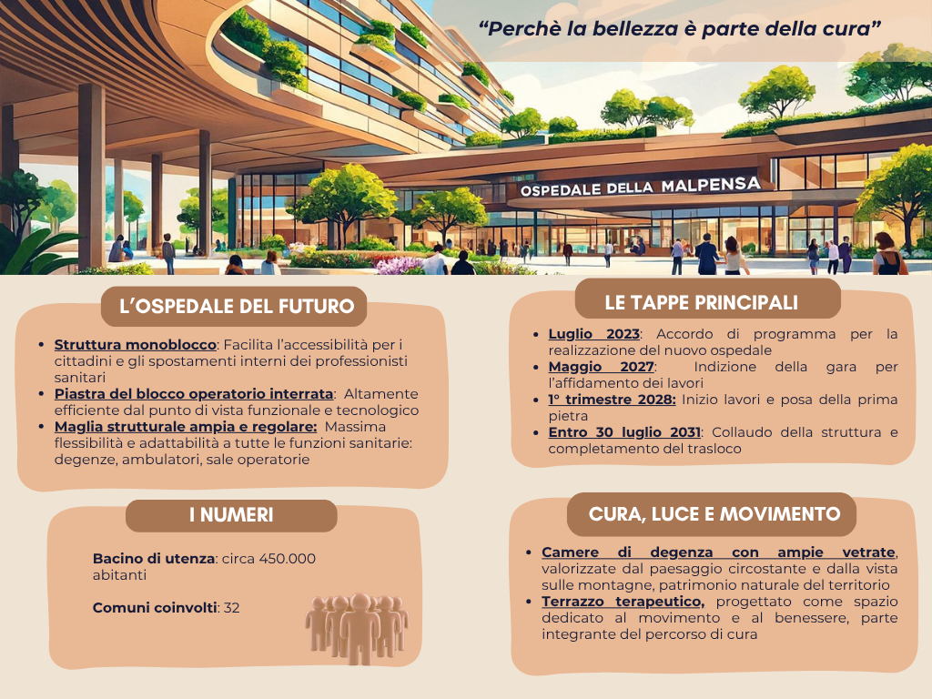 La nuova struttura ospedaliera, unione dei nosocomi di Busto Arsizio e Gallarate, servirà un potenziale bacino d’utenza di circa 450 mila di abitanti; il progetto presentato ha visto l’integrazione tra nuove tecnologie, efficienza ed efficacia operativa, in grado di soddisfare alcuni obiettivi importanti: dare risposte concrete alla crescente domanda sanitaria della Regione, mixare tecnologie mediche avanzate con un design centrato sulla persona e assicurare agli utenti di riferimento l’accesso a servizi clinico-assistenziali di altissima qualità.