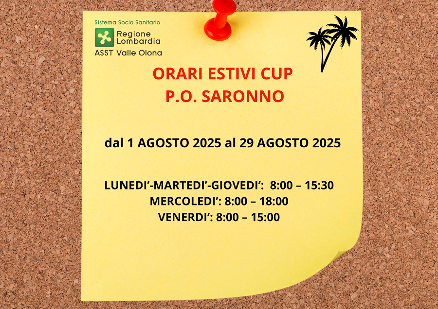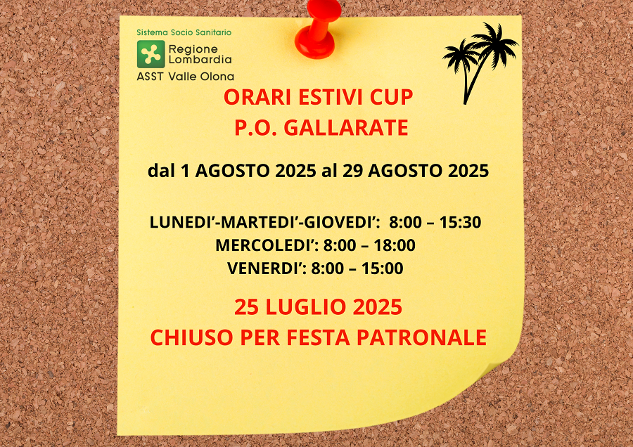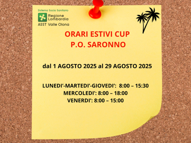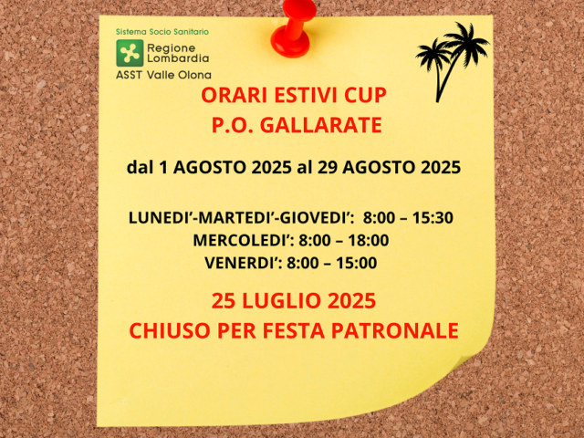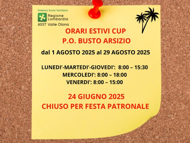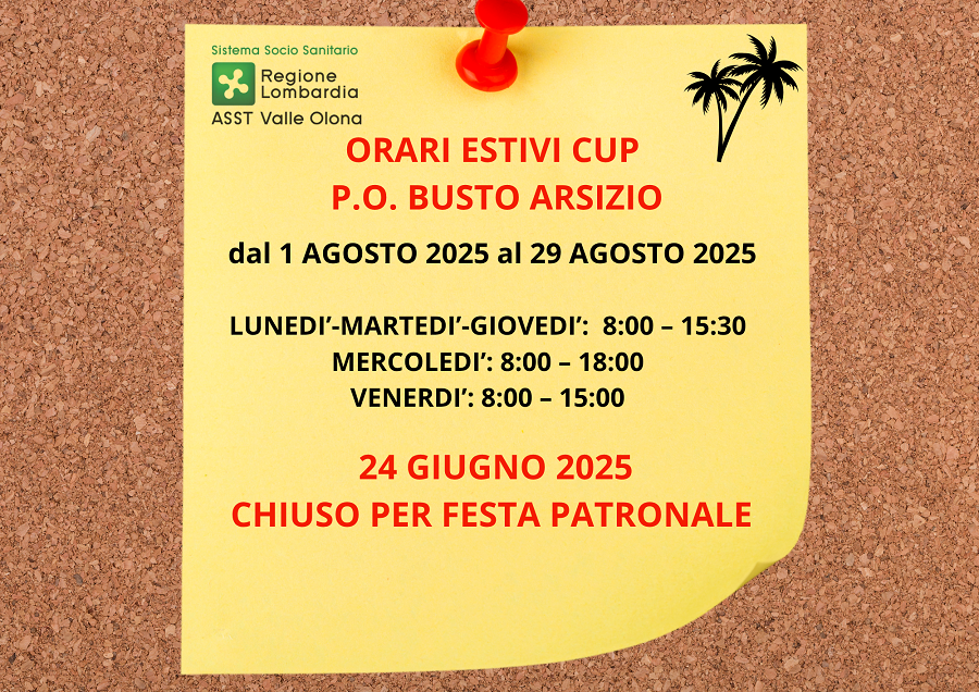 Qui di seguito comunichiamo variazioni degli orari di apertura dei CUP aziendali (Centri Unici di Prenotazione) e le chiusure straordinarie per le prossime feste patronali.